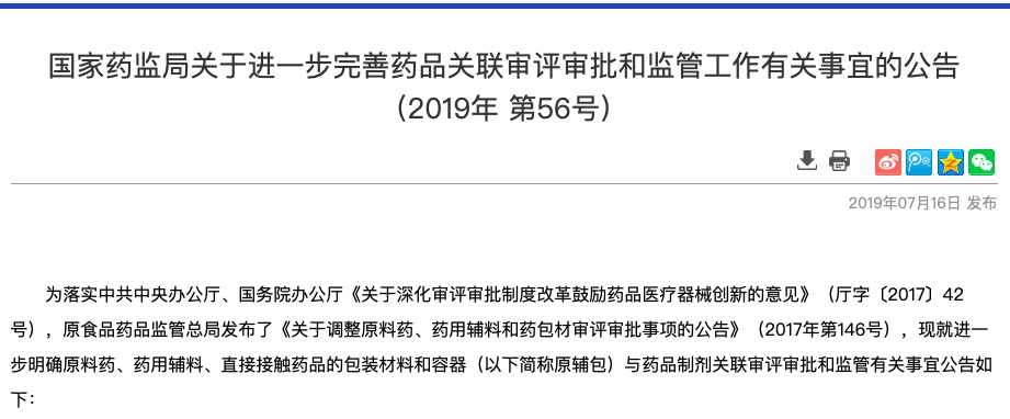 為落實(shí)中共中央辦公廳、國務(wù)院辦公廳《關(guān)于深化審評(píng)審批制度改革鼓勵(lì)藥品醫(yī)療器械創(chuàng)新的意見》(廳字〔2017〕42號(hào)),原食品藥品監(jiān)管總局發(fā)布了《關(guān)于調(diào)整原料藥、藥用輔料和藥包材審評(píng)審批事項(xiàng)的公告》(20
